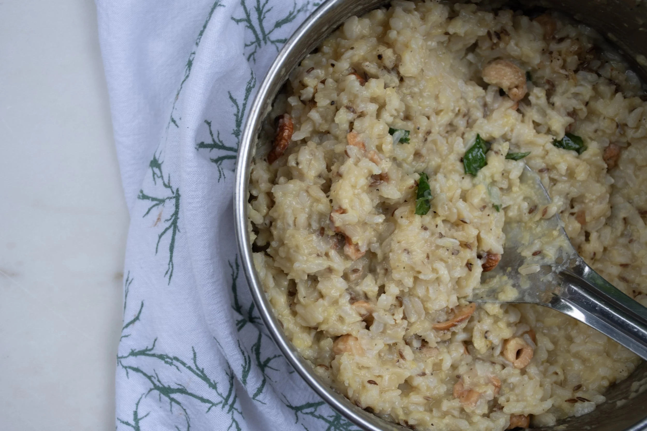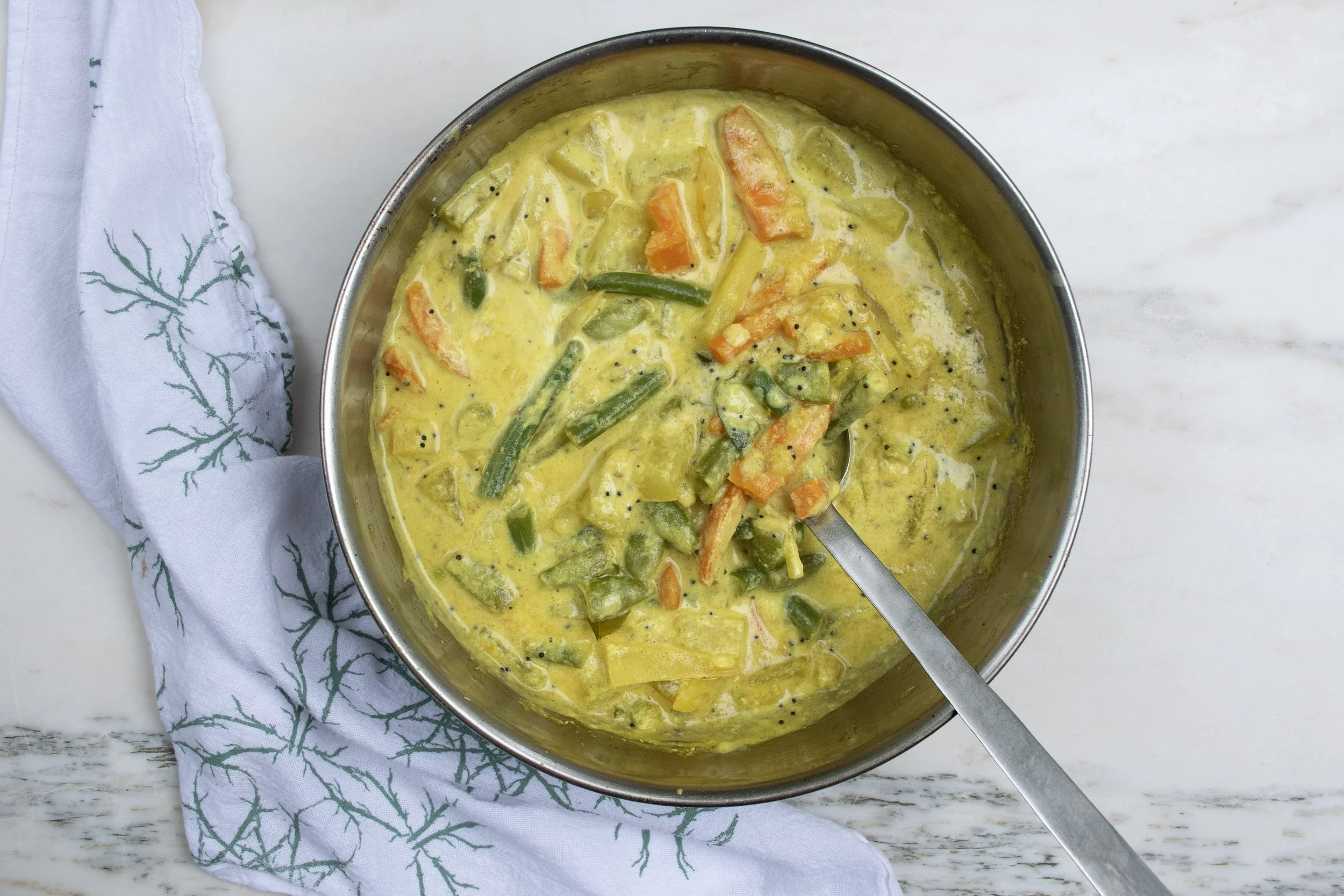This meal kit includes three of my favorite dishes: Pongal, Avial, and Ellu Bella. Pongal is made with rice and split yellow moong dhal, enriched with plenty of ghee and flavored with fresh ginger, cumin, curry leaves and black pepper. It is a nourishing and comforting dish—the only dish I enjoy with generous amounts of ghee (though butter or oil can easily be substituted).