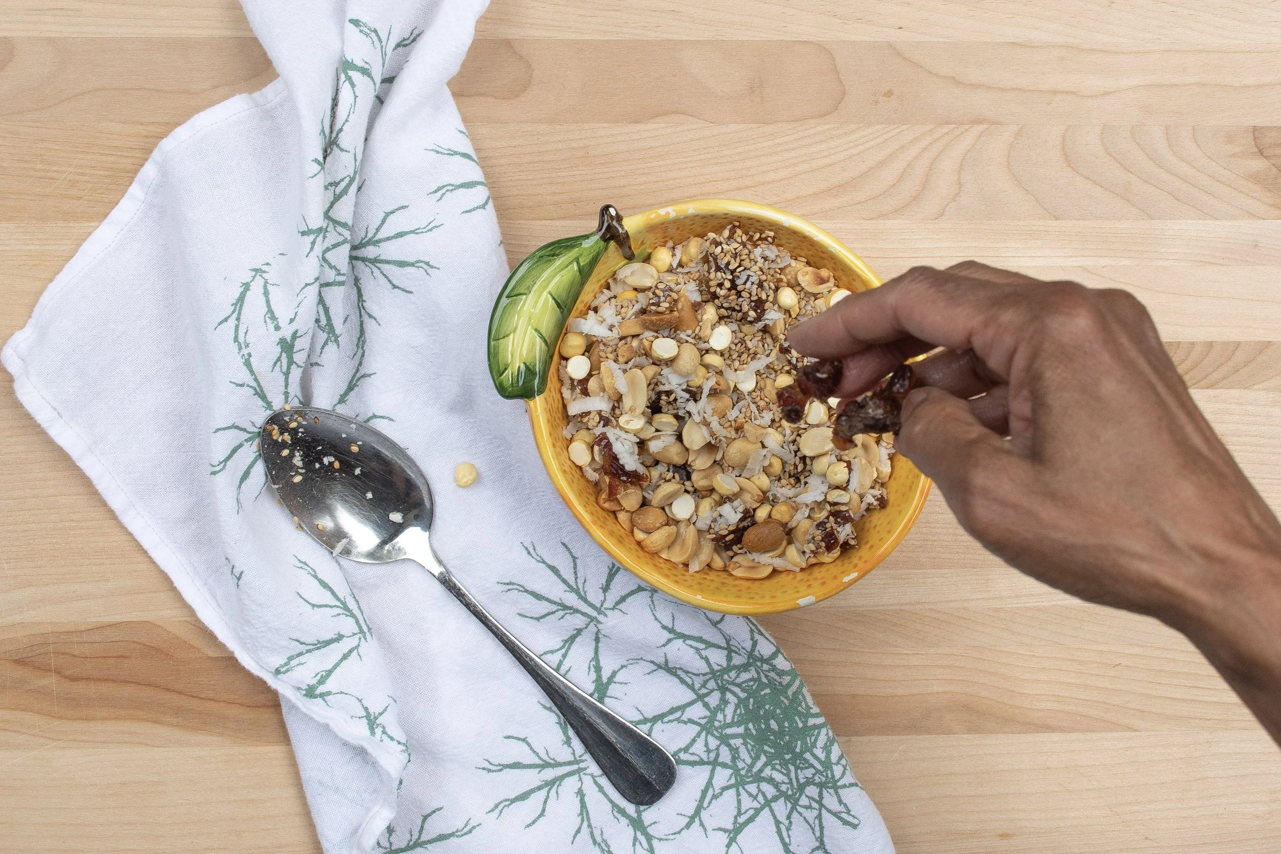 Avial is a refreshing, colorful vegetable dish cooked in a coconut and yogurt sauce, spiced with cumin and green chilies. Ellu Bella is a nutritious snack I learned from my mother-in-law. This traditional Karnataka dish is made especially for Pongal and shared with family and friends as a harvest offering. I include it here as a tribute to her.